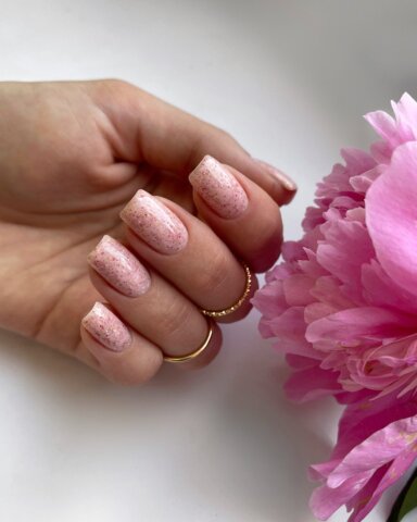 Pastel colors look harmonious and perfectly complement any look, and interspersed with different-sized particles add interesting visual effects. Shade 03 is the most delicate color of pink powder with galactic dust particles. The base has a medium consistency and the ability to self-leveling. It is easy to apply with a brush and does not flow on the nail walls and cuticles. The base is characterized by durability subject to observance of application technique.